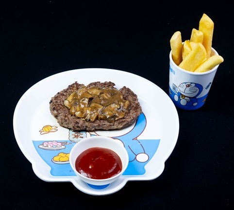 Wagyu burger steak (minced beef), served with mushroom sauce and French fries